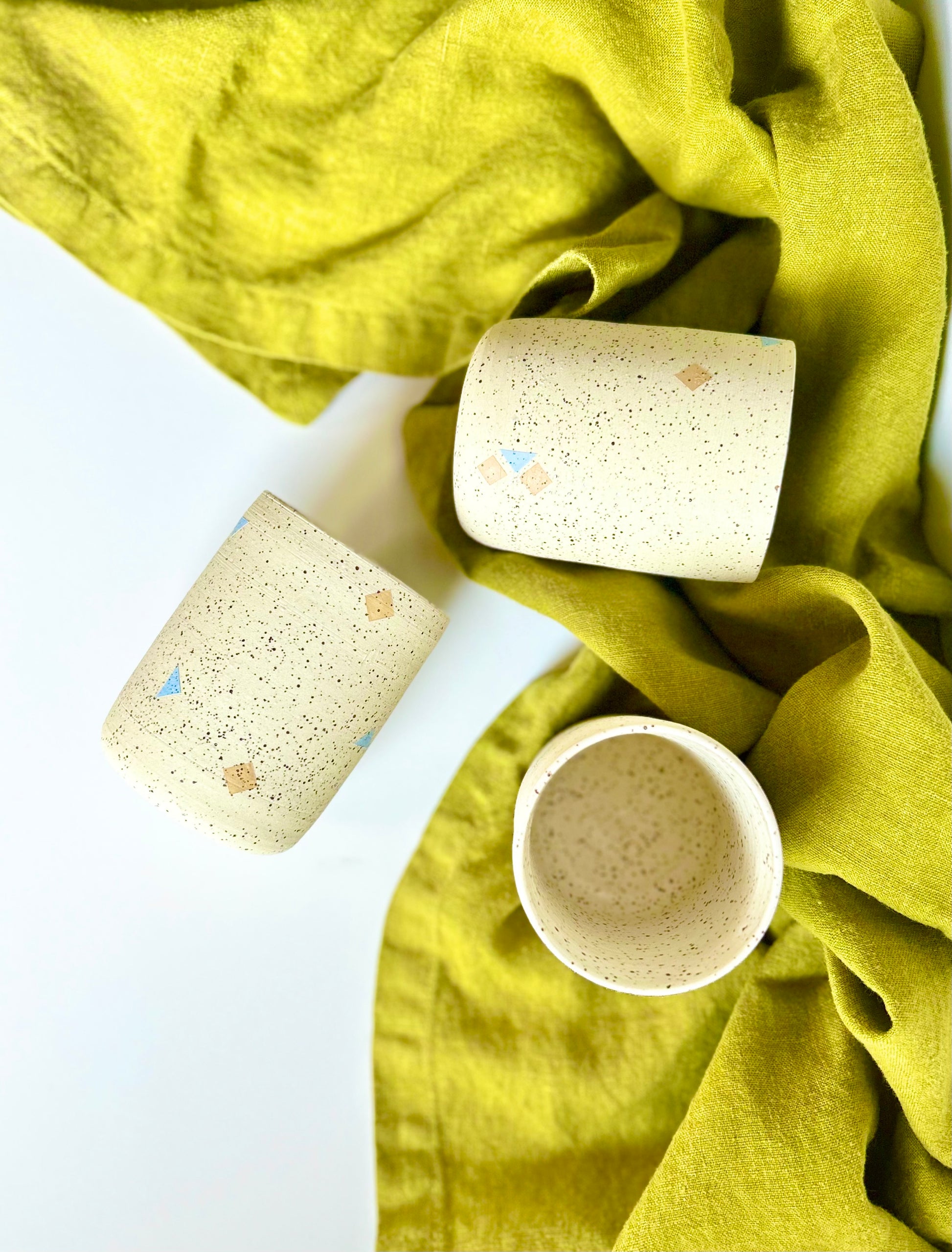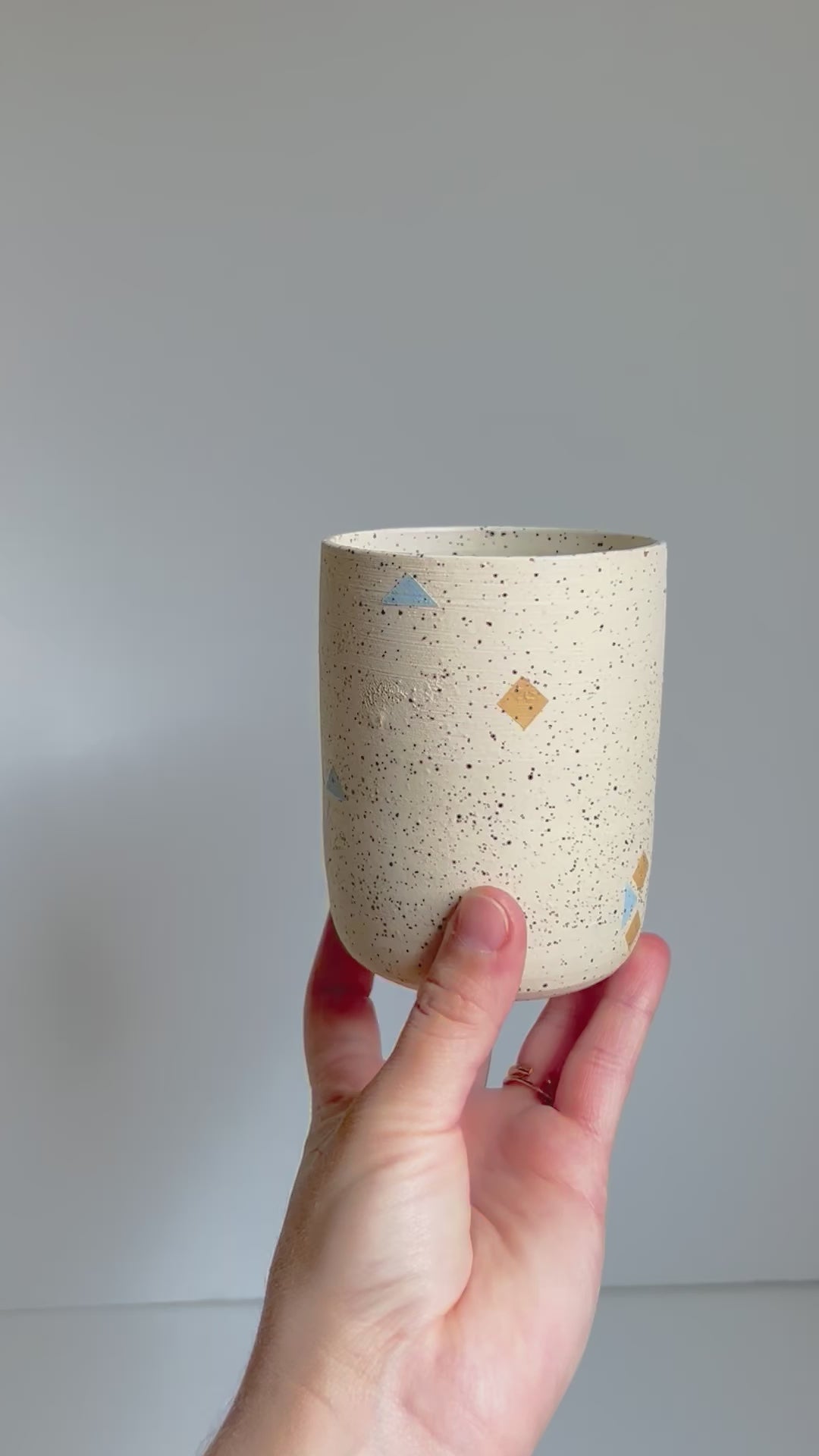 Each vessel is handmade from a speckled stoneware clay and hand-painted with unique glazes. Because of the nature of handmade goods, not every item is exactly the same. Small imperfections and variations in each piece are what make handmade goods one of a kind.